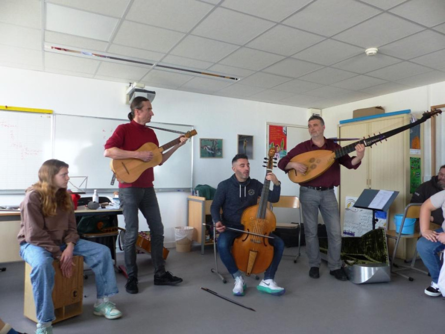 Nous avons participé, vendredi 15 mars, à un atelier de musique baroque, au collège, grâce à la présence de deux musiciens et chanteurs : Marco et Francisco. Les deux musiciens nous ont fait découvrir leurs instruments de musique et plus précisément la viole de gambe, la lyre baroque, la guitare baroque et le théorbe.